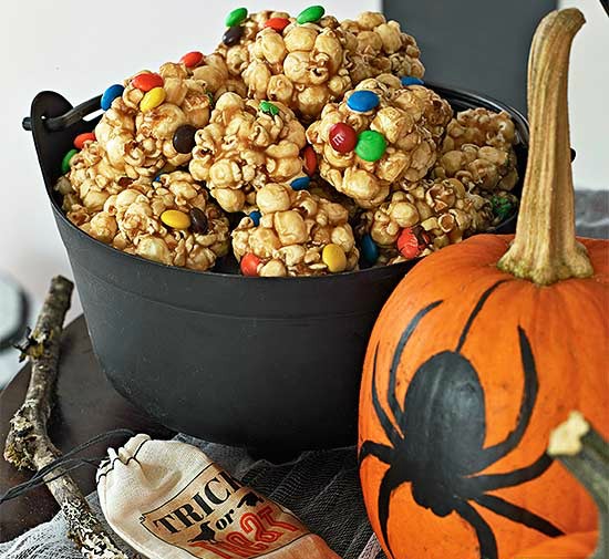 Classic popcorn balls taste even better when you sneak in a few candy treats! Coat your microwave popcorn with homemade brown sugar syrup, then sprinkle with candy-coated chocolate before rolling into balls.