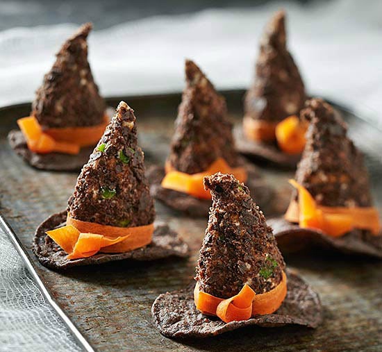 Cast a spell on your next Halloween party with this savory snack. Though it might look like you should wear them, these fashionable witch hats are actually taco-flavor cheese balls atop tortilla chips.
