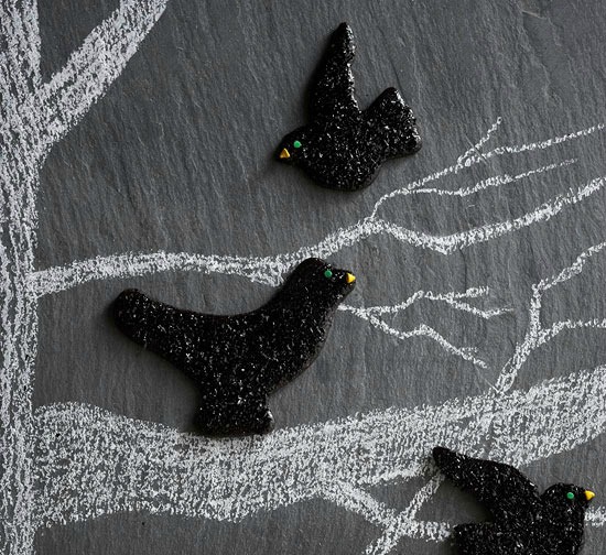 Beady-eye blackbirds aren’t so menacing when they’re Halloween treats. Use bird-shape cookie cutters or sub in other black Halloween figures, such as a cat or a witch to make sugar cookies (you could even die the dough for a real menacing look). A brushing of corn syrup after baking is the trick to getting the black sugar coating to stick.