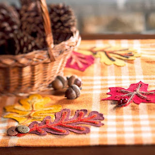 Add simple felt leaves to a table runner for instant fall inspiration. Leaves are tacked in place using a simple felting process, making the detailed table runner a fun project that can be created in a few hours.