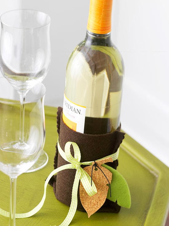A pretty felt sleeve adds quick style to a wine bottle and protects surfaces from drips and rings. Cut a rectangle of felt with pinking shears. Fold it in half and stitch or glue the sides together. Slip over a bottle and tie with ribbon. Cut leaf and acorn shapes from felt or thin cork to add to the ribbon.