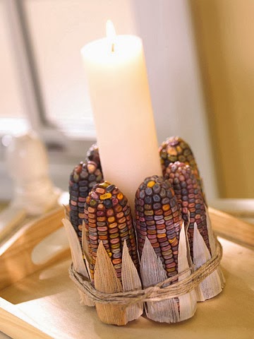 Circle a tall candle with same-size corncobs and their husks. Fold the husks of corncobs over the cobs. Cut the husks into triangular shapes. Stand the corncobs around the base of a candle and hot-glue them together. Wrap twine around the corncob circle and tie.