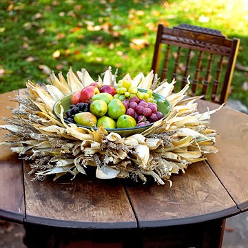 Creatively display cornhusks in an autumnal wreath centerpiece. Start with a straw wreath, cornhusks, and corn tassels.