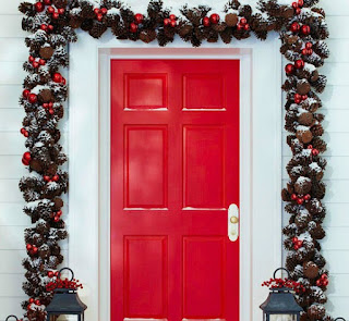 Dress up your entryway with a festive Christmas garland for a look that’s both welcoming and of-the-season. To make this outdoor holiday decorating idea your own, customize a ready-made pinecone garland with ornaments that coordinate with your door color. Position the garland outside the door frame and secure at the top and sides with self-adhesive hooks or brick clips.