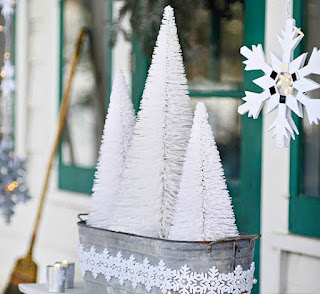 Bottlebrush firs look like miniature frosted evergreens when arranged in a wintry bucket planter. Votive candles add a calming, flickering glow to this outdoor Christmas decoration.