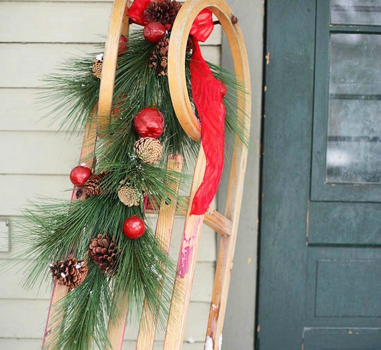 When not cruising the snow-covered hills, an old sled embellished with pine sprigs, pinecones, and fruit does double duty as a welcoming Christmas decoration next to the front door. A bright red ribbon on top ties the look together.