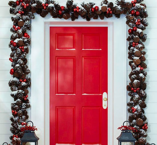 Dress up your entryway with a festive Christmas garland for a look that’s both welcoming and of-the-season. To make this outdoor holiday decorating idea your own, customize a ready-made pinecone garland with ornaments that coordinate with your door color. Position the garland outside the door frame and secure at the top and sides with self-adhesive hooks or brick clips.
