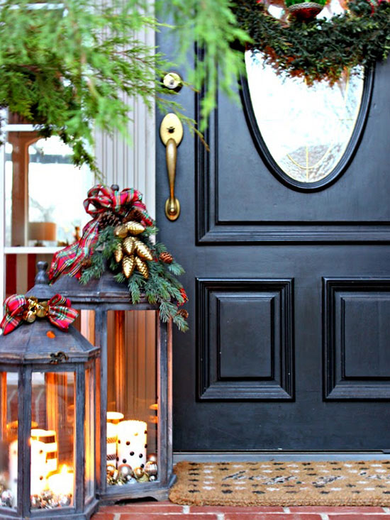 Add the soft glow of candlelight to your front porch with decorated lanterns filled with ornaments and topped with beautiful bows and greenery.