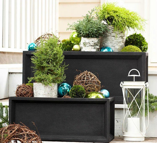 Ornaments aren’t just for the tree! Give your outdoor planters a holiday makeover with a few round ornaments, birch branches, and grapevine balls {use plastic ornaments to avoid breakage}.