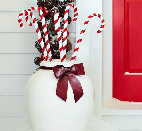 Take inspiration from classic Christmas candy and fill a white planter with decorative candy canes for a unique outdoor holiday decorating idea. Store-bought plastic canes and weather-treated ribbon mean this front door decor can last throughout the season.