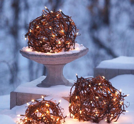 Spheres of grapevines wrapped in Christmas lights become shimmering orbs on a coat of freshly fallen snow. Place these magical globes in birdbaths, urns, or on stairsteps to cast an ethereal glow on your outdoor landscape.