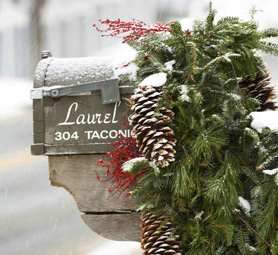 Prepare a merry welcome at the curb — a pretty swag of pine tied on with wire adds a flourish to your mailbox. Embellish it with red accents and pretty pinecones {then pray for snow as it will only enhance the look =)}.
