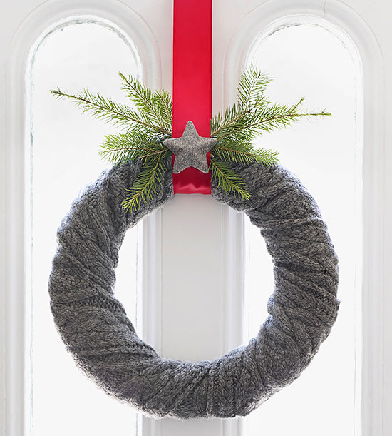 Four supplies and five minutes are all you need to make an adorable scarf wreath. Simply wrap a wool scarf around a foam or straw wreath form, pinning it in place as you go. Pin your final wrap and hang with ribbon. A sprig of spruce and cozy star decoration are optional add-ons.