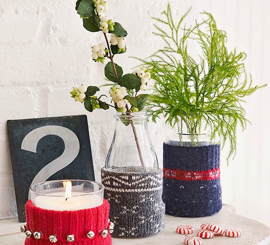 Arm yourself with an adorable votive wrap made from the cuff of a sweater. Simply fit the arm of the sweater around a votive or vase and cut off the ends about 2 inches longer than the votive or vase. Fold the ends and hot-glue in place. Slip sweater over the votive or vase.