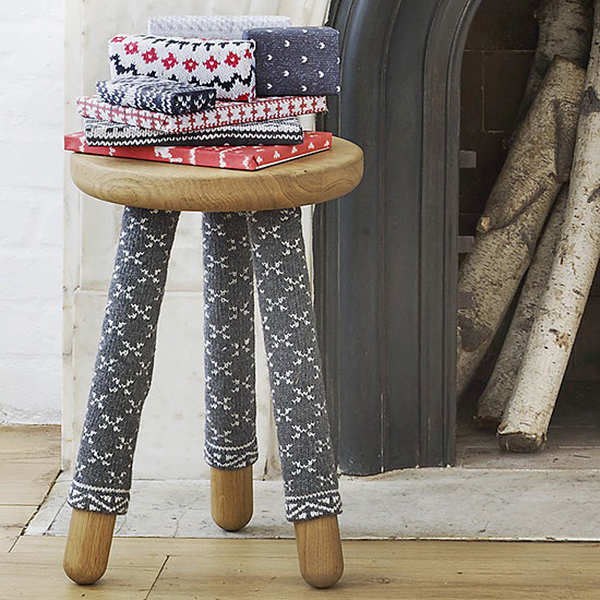 What stool wouldn’t appreciate some leg warmers? To make, measure the legs of your stool and trim arms of a sweater to match. Cut the arms in half lengthwise and sew a seam in each to create the legs. Turn inside out and fold down 1 inch on each end of the arms. Sew hem to create a finished edge. Turn right side out and pull the arms onto the stool legs.
