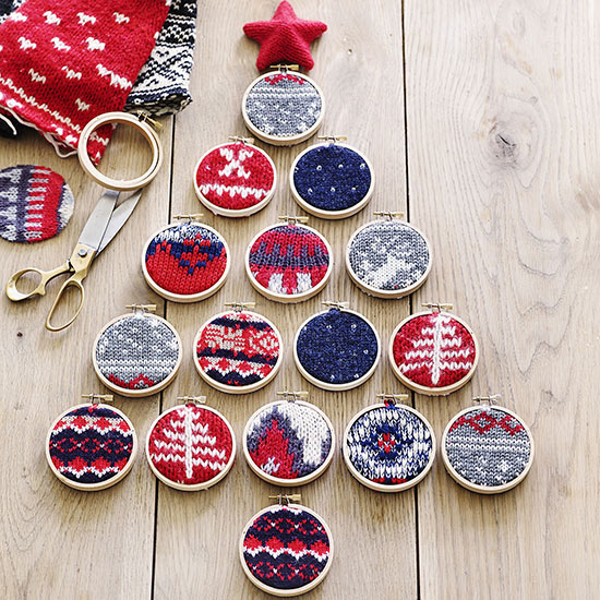 Make a ready-for-the-wall tree design with 16 small embroidery hoops (we used 3-inch-wide hoops) and interesting cuts from a Christmas sweater. Simply place the sweaters inside the hoops, fasten, and trim excess. Lay out in a tree pattern and use removeable adhesive to attach to your wall.