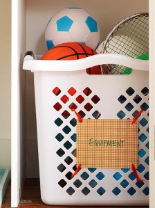 A simple laundry basket is the ideal candidate for storing bulky sports equipment. These spacious vessels are affordable and durable and can handle plenty of wear and tear. To affix a label to the basket, punch holes in the corners of the labels. Run zip ties through the holes and through the weave of the basket to attach.