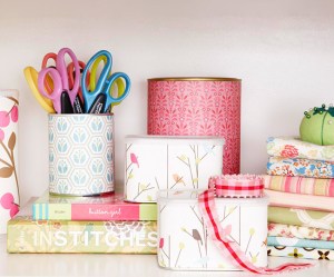 Turn coffee tins, soup cans, and powdered drink tubs into pretty storage containers by covering them with decorative papers. Cut the paper to size, then attach with spray adhesive or double-stick tape. They’re perfect for holding pencils, pens, scissors, and other desk or crafts supplies.