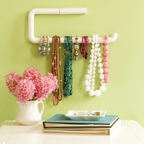 Elegantly display necklaces and bracelets on a paper towel holder. Install it on the wall above a dresser or vanity for organization that doubles as a piece of art.