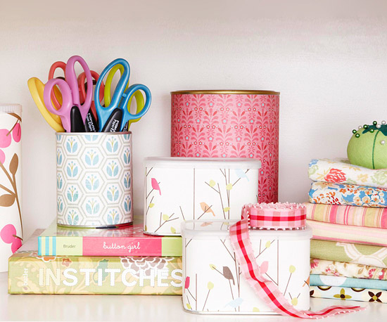 Turn coffee tins, soup cans, and powdered drink tubs into pretty storage containers by covering them with decorative papers. Cut the paper to size, then attach with spray adhesive or double-stick tape. They’re perfect for holding pencils, pens, scissors, and other desk or crafts supplies.