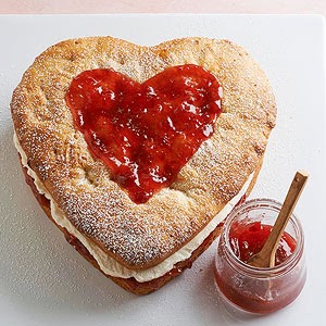 In a medium bowl stir together 2 cups of the flour and the yeast; set aside. In a medium saucepan heat and stir milk, granulated sugar, butter, and salt just until warm (120 degrees F to 130 degrees F). Add milk mixture to flour mixture. Add eggs and vanilla. Beat with an electric mixer on low speed for 30 seconds, scraping the sides of the bowl constantly. Beat on high speed for 3 minutes. Using a wooden spoon, stir in remaining flour (dough will be very soft and sticky). Cover surface of dough with plastic wrap; chill for 2 to 24 hours. Generously butter a 9×2-inch deep heart-shaped or round cake pan. Using a buttered spatula, transfer dough to prepared pan and smooth to an even layer. Cover; let rise1 hour or until double in size. Preheat oven to 325 degrees F. Bake for 30 to 35 minutes or until golden brown. Cool in pan on wire rack for 5 minutes. Remove cake from pan; turn top-side up. Cool completely on wire rack. Using a long serrated knife, split cake in half horizontally; remove top. Place bottom layer, cut-side up, on a serving plate. Spread with jelly. Spoon Cream Filling over jelly; spread to edges. Place top layer of cake on filling, cut-side down. Dust cake with powdered sugar; decorate with jelly.