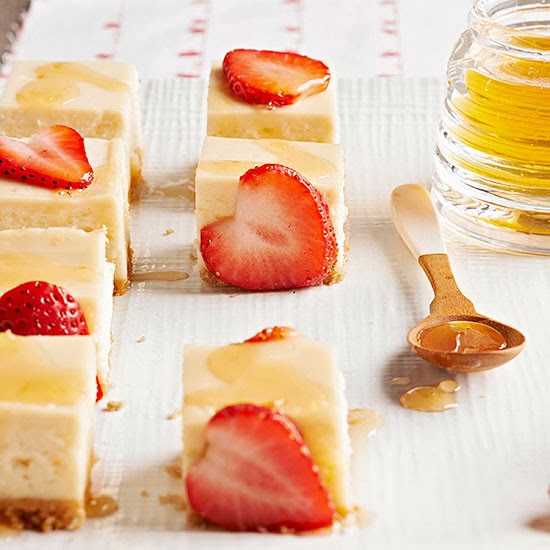 Every nibble of these sweet honey-topped morsels features crumbly shortbread crust and classic cheesecake filling. The sweetest part? The naturally heart-shape strawberry slices.