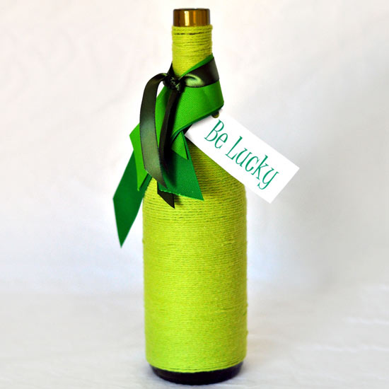 Repurpose a wine bottle into a pretty St. Patrick’s day craft. To make, wrap green yarn or embroidery floss around the neck of the bottle, securing the loose end underneath the yarn as you go. End your wrapping an inch or so from the bottom of the bottle; secure with a dab of hot glue. Use a variety of different green ribbons to tie on a seasonal St. Patrick’s Day tag.