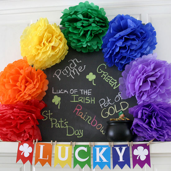 Tissue paper flowers surround a chalkboard for a pretty Irish-theme mantel decoration. To make each flower, stack eight sheets of colored tissue paper, making sure to line up the edges evenly, and accordion-fold (each fold should be 1-1/2 inches wide). Wrap a piece of wire around the middle, and round the corners of the horizontal stack with scissors. Carefully separate each sheet, pulling it toward the center.