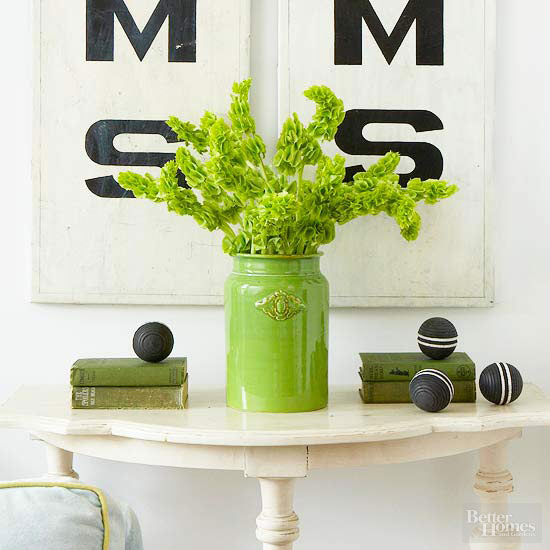 Long stems of bells of Ireland in a green or white vase create a beautiful, classic St. Patrick’s Day touch. Offset the vase with antique green books and vintage croquet balls, as Ireland is one of the founding countries of croquet.
