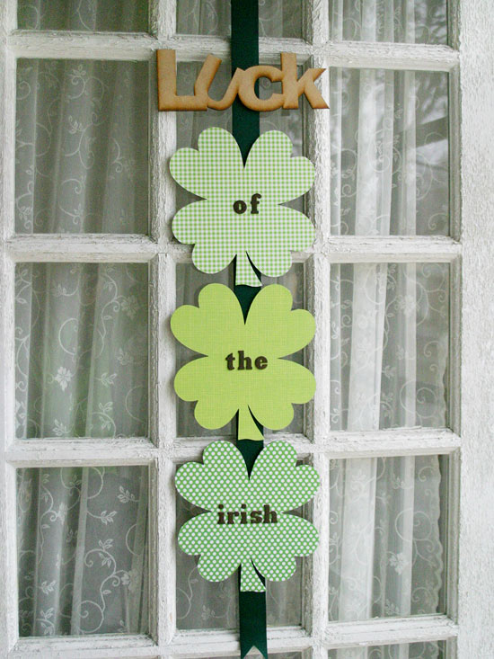 Bring a bit o’ luck to your home with this simple but eye-catching St. Patrick’s Day door hanging. Start with wooden shamrock shapes (available at most crafts stores). Use spray adhesive to attach a variety of green scrapbook papers to the wooden shapes; let dry. With a utility knife or scissors, cut out the shamrock shapes. Apply Mod Podge with a foam brush; let dry. Attach the shapes to a length of ribbon using glue dots; add scrapbook letters to each one. Top the hanging with a wooden “luck” cutout.