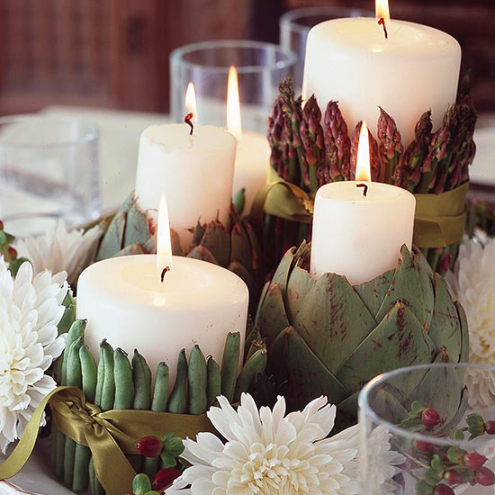 Create a creative St. Patrick’s Day centerpiece with green veggies and white candles. To make, stretch two rubber bands around a pillar candle, then tuck green beans or asparagus under the bands. Cover the rubber bands with satin ribbon. To make the artichoke candleholder, cut the top and a bit of the center out of the artichoke. Set the candle in the hole.