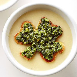 Smoked cheese, curry and paprika add depth of flavor to this easy potato soup. For St. Patrick’s Day, decorate with shamrock-shaped toast topped with pesto.