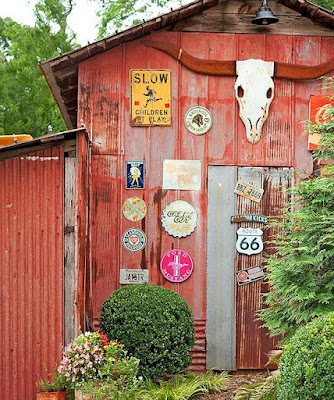 Express your personality by outfitting an outbuilding or porch wall with meaningful signage. On this structure, vintage advertising signs, outdated license plates, and road signs combine to fashion a fetching exhibit that reflects the homeowners’ travels and interests.