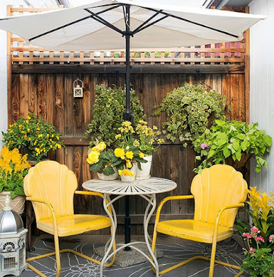 Painted metal lawn chairs (just like Grandma and Granddad’s outdoor seating) remain sentimental favorites that blast us back to gentler times. Find original vintage versions at sales, antiques shops, and Internet auction sites; reproduction options are seasonally available at home centers and discount stores. Complete the retro look with an antique iron table and a freestanding umbrella.