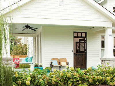 Think of your porch as an outdoor great-room that can easily and chicly! accommodate sitting, dining, and display. Hang vintage mirrors to reflect the landscape; lay area rugs for underfoot warmth; and repurpose flea market tables, shelves, and chairs (check out those vintage director chairs) to handle your form and function needs. Showcase canning jars, old-timey pottery, and vivacious fabrics to give shabby furniture finishes a lift.