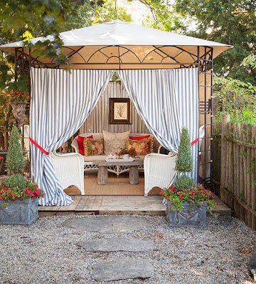 Whether crafted of lattice, fabric, or iron, walls define an outdoor room, create a sense of enclosure, and — most important for the collector — provide backgrounds for displaying cool things. This tented gazebo showcases a fine-tuned arrangement of vintage wicker, captivating fabrics, and accessories such as a tree-trunk table and the framed painting over the wicker love seat.
