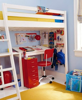 Just because there isn’t enough room in your child’s bedroom for a desk doesn’t mean they can’t have their own personal study space. Using a twist on under-bed storage, the area below a store-bought loft bed becomes a welcoming small-scale study.
