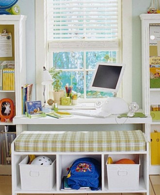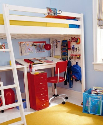 Just because there isn’t enough room in your child’s bedroom for a desk doesn’t mean they can’t have their own personal study space. Using a twist on under-bed storage, the area below a store-bought loft bed becomes a welcoming small-scale study.