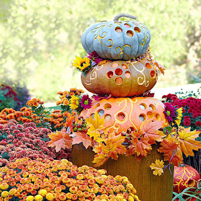 Smooth-skin gourds are a great way to add cool pumpkin carving to your decorating repertoire. Choose varieties in distinctive seasonal colors, such as yellows, greens, and reds. To create these luminarias, cut a hole in the side of each gourd large enough for your hand; scrape out the inside. Mark your chosen design on the gourd using a pencil or ballpoint pen. Carve the design with an awl, paring knife, or crafts knife, or use a power drill and different-size bits. Illuminate the gourds with strands of LED lights.