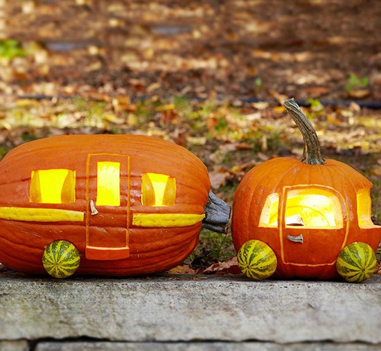 Your car aficionado will love this pumpkin road duo. Download the patterns; transfer to your pumpkins and cut the opening to on the bottom of your finished design. Cut out the windows and windshield. Then use a gouging tool to outline the car and camper doors. Cut out a small rectangle under the camper door, and wedge in a scrap of pumpkin for the threshold. Embellish the car and campers with wheels, door handles, and curtains using pieces of small, colored gourds; secure with toothpicks. Cut out a stripe along the camper and insert a long strip of gourd to finish.