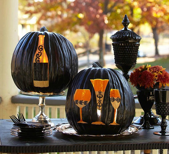 Great for a Halloween party buffet decoration as well as a front porch accent, these sophisticated pumpkins are easier to make than they look. Download the patterns and transfer to two real or faux pumpkins; carve out the top and bottom areas of the glasses, then outline the center area of each glass and the bottle. Outline the decorative details on the glasses; gouge the areas inside the outlines and around the details until smooth. Outline the label and the bottle curlicues; lightly gouge the rest of the area inside the bottle outline to make it smooth.