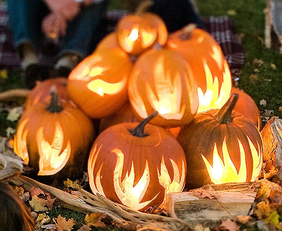 If you have a little more time, you’ll have fun pulling together this cool carving idea. Add the bonfire centerpiece to a backyard table or use it as a focal point in front. You’ll need about 10 to 12 pumpkins and flickering candles to make these flames come to life.
