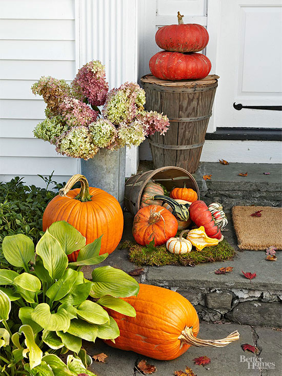 Simple and Large Scale can get the job done.Β If you have the space, add a large container like a wheelbarrow or wagon to your porch. Fill it with an assortment of fall elements, such as bittersweet, pumpkins, gourds, and leaves. We love the idea of adding a message to the pumpkins! This decoration can easily span the fall holidays, taking you right through Thanksgiving. CO:Β BHG.com