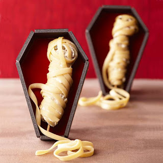 Wrap a legion of scary mummies for a Halloween dinner or party appetizer. To make, skewer a purchased meatball and a 4-inch piece of summer sausage stick with a 6-inch wooden skewer. Combine 8 ounces cream cheese and 1 teaspoon purchased pesto. Spread some of the mixture over the meat skewer and wrap with cooked fettuccine noodles. For a more bulky body, spread with additional cream cheese mixture and wrap with another layer of cooked fettuccine. Add capers for eyes. Serve with pasta sauce for dipping, and these Halloween finger foods will be gone in no time.