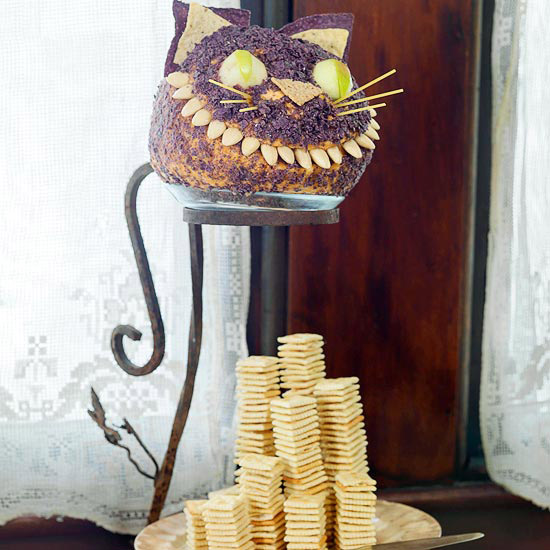 Your Halloween party guests will get wide grins on their own faces when they see this black cat on the table. Filled with cheeses, garlic, onion, pimiento, and spices, the cheese ball has a savory kick that makes great Halloween party food for adults. Rolled in crushed blue tortilla chips, this grinning cat tastes as good as it looks. Make the cheese ball ahead so you have plenty of time to enjoy the compliments. Recipe