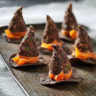 A wicked witch is definitely not sweet, and neither is her hat. Blue corn tortilla chips give these salty, cheesy, and slightly spicy Halloween appetizers their dark color, and a thin carrot peel adds some witchy style. Serve with extra chips to dip. Recipe