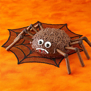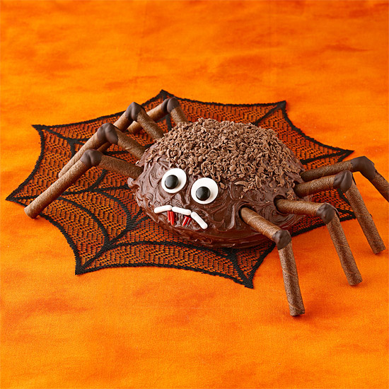 A 9-inch round chocolate cake (from a box or from scratch) can be trimmed and decorated to look like many people’s worst nightmare: a spider. But with rolled wafer-cookie legs—held together with melted chocolate—and a chocolate sprinkle-coated body, this spider cake is a delight instead of a fright. Give it a classy-creepy appeal by keeping it faceless, or a kid-friendly look using licorice, chocolate pieces, and other candies.