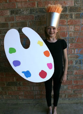 Dress in a solid color to represent the handle of the paint brush, then cut a piece of poster board and spray paint it silver, and glue to fit head. Use two brooms {with strong bristles} ~ cut the handles off so you have only the bristles and glue them inside the hat to resemble the top of the paint brush. Use a poster board glue to card board for the pallet and use sharpies for the paint.