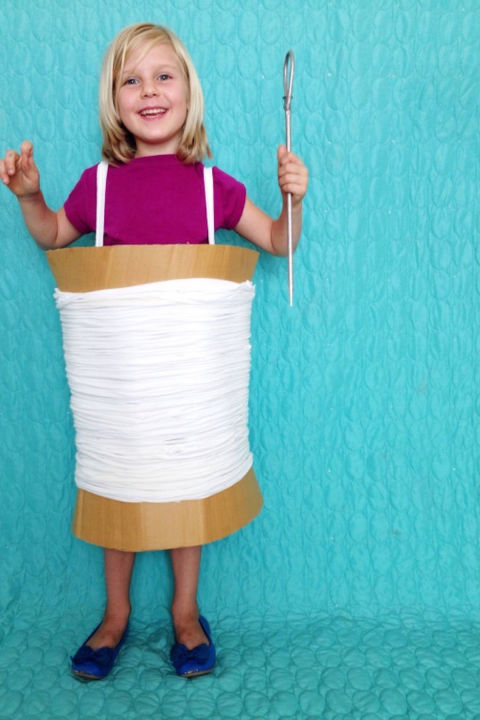 Start with a large lampshade (this is just to stabilize the cardboard) and cut off any wire in the center of your lampshade, cover any exposed wire with duct tape. Cut two cardboard so you have 2 pieces that will wrap around the top and bottom of the lamp shade. and duct tape into place. NOTE: You could also use a large cardboard box if you are lucky enough to find one, then you wouldn’t need the lampshade. Next, make yourself a bunch of t-shirt yarn. Let Birds Fly has a pretty awesome photo-tutorial if you’ve never made it. Wrap your lampshade generously with yarn and add some extra t-shirt fabric for straps and you have yourself a giant spool costume. To make a needle, just get creative, use cardboard cut out in the shape, use duct tape, etc.