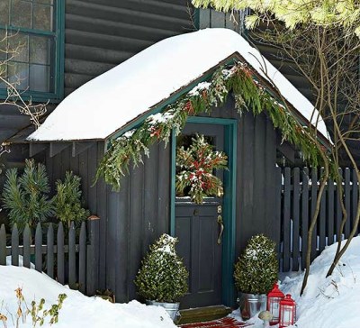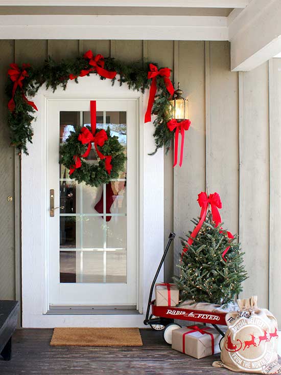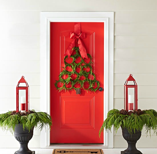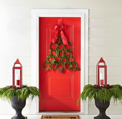 Impress the neighbors with an extraordinary wreath that’s surprisingly easy to do yourself. Simply wire a handful of mini cedar wreaths to one another to create the shape of an evergreen tree. Use a red ribbon to hang the wreath on a door (bonus points if the door is red) and decorate planters with matching lanterns.